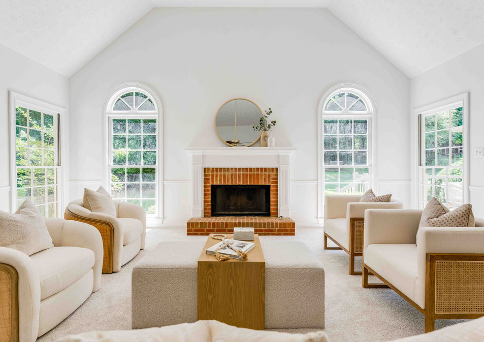 You're welcomed by a bright, airy layout filled with natural light, soaring 9ft ceilings, brand-new carpet, and fresh, head-to-toe paint in a soft, neutral palette—completely move-in ready and waiting for your personal touch. To the right of the foyer, a formal dining room offers the perfect setting for both lively holiday gatherings and quiet Sunday dinners. Enjoy an oversized family room ideal for everyday living and effortless entertaining, highlighted by a vaulted ceiling that adds space and light, a cozy brick fireplace that invites you to relax and unwind, and easy access to the back deck—perfect for morning coffee, evening get-togethers, or simply enjoying the peaceful surroundings.